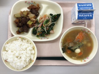 ご飯・ふっかちゃんの絆焼き鳥・もやしのナムル・重忠汁・牛乳