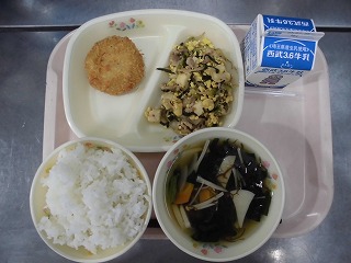 〈献立名〉牛乳、ごはん(学校炊飯:白飯)、カレーポテトコロッケ、ゴーヤチャンプルー、もずくスープ