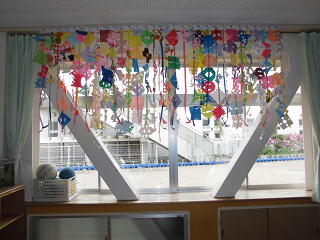 今日は、1年2組の図工で「チョキチョキかざり」をしたあと、