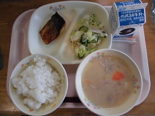 〈献立名〉牛乳、白飯、さばのカレー焼き、たくあんサラダ、スタミナスープ