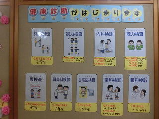 聴力検査や内科検診を始め、各種健康診断が始まっています。予定表で検査日の確認をお願いします。また、後日、結果がご家庭に届きますので、お子様の成長ぶりや健康状態を確認するとともに、治療のお知らせが届いた際には、早めの対応をお願いいたします。