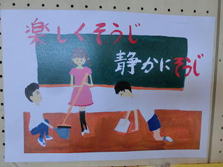 無言清掃の貼り紙が、校内のあちらこちらに掲示されています。みんな、黙って掃除できるようになってきました。