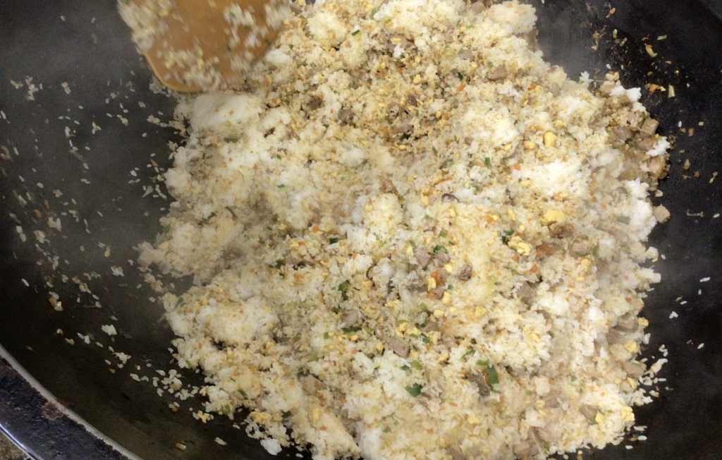 調理員さんたちがお米を洗って炊いて、炒り卵を作り、肉屋さん自家製の焼豚をたっぷり入れて具を炒め、炊きあがったご飯と混ぜておいしいチャーハンが出来ました